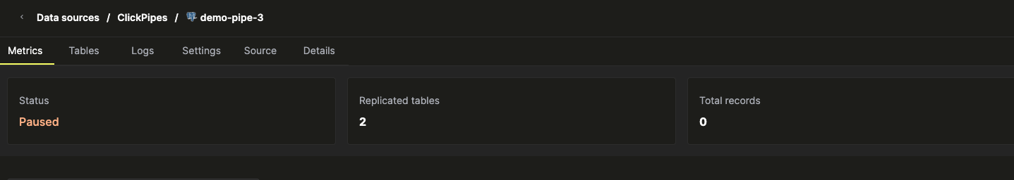 - На вкладке Data Sources нажмите на MongoDB ClickPipe, который нужно возобновить. Статус зеркала изначально должен быть Paused.